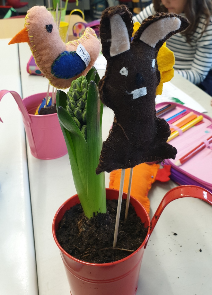 Zur Krönung wurde dann eine Hyazinthe für jedes Kind eingetopft. Die Freude war riesengroß, als die Kinder nach wochenlanger Arbeit ihren bunten Blumentopf mit nach Hause nehmen durften. Und die Eltern haben sich bestimmt genauso gefreut.