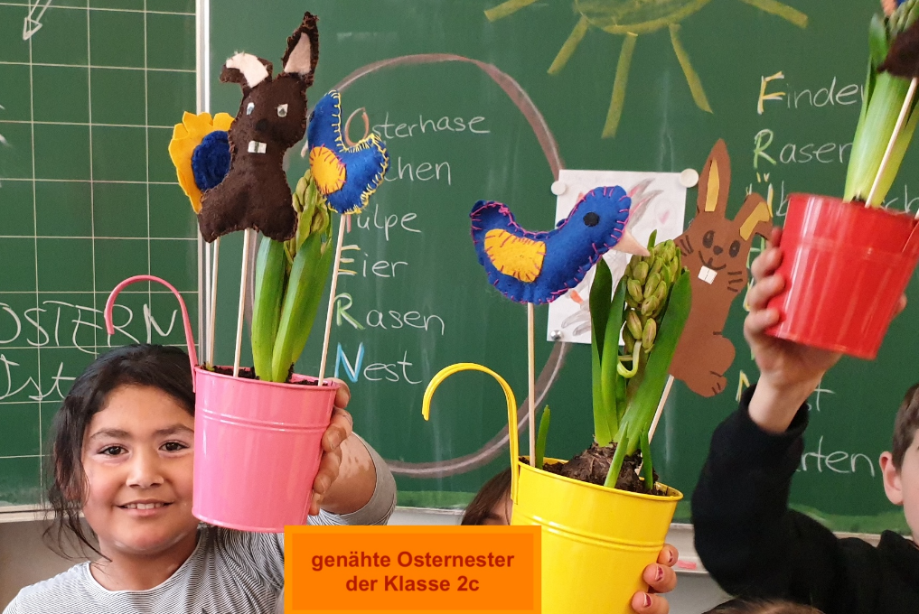 Und da die Kinder so begeistert waren, fragte die Lehrerin: „Wollt ihr für Ostern wieder etwas nähen?“ Und so ging die Näherei gleich weiter. Bereits im Januar wurden fleißig Vögelchen genäht, dann ein Blümchen mit einer fingergehäkelten Schlange verziert und viele schafften es sogar, noch einen großen Hasen zu nähen. Manchen wurde es dann zu viel und sie haben den Hasen dann einfach aus Papier gebastelt. Hauptsache es ist jetzt alles schön bunt!